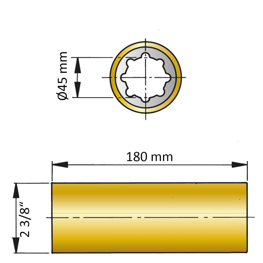 ØA 45 mm x ØB 23/8" x C180 mm - vandsmurt stævnrørsleje / gummileje i messing